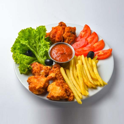 Острые куриные крылья с картошкой фри, салат